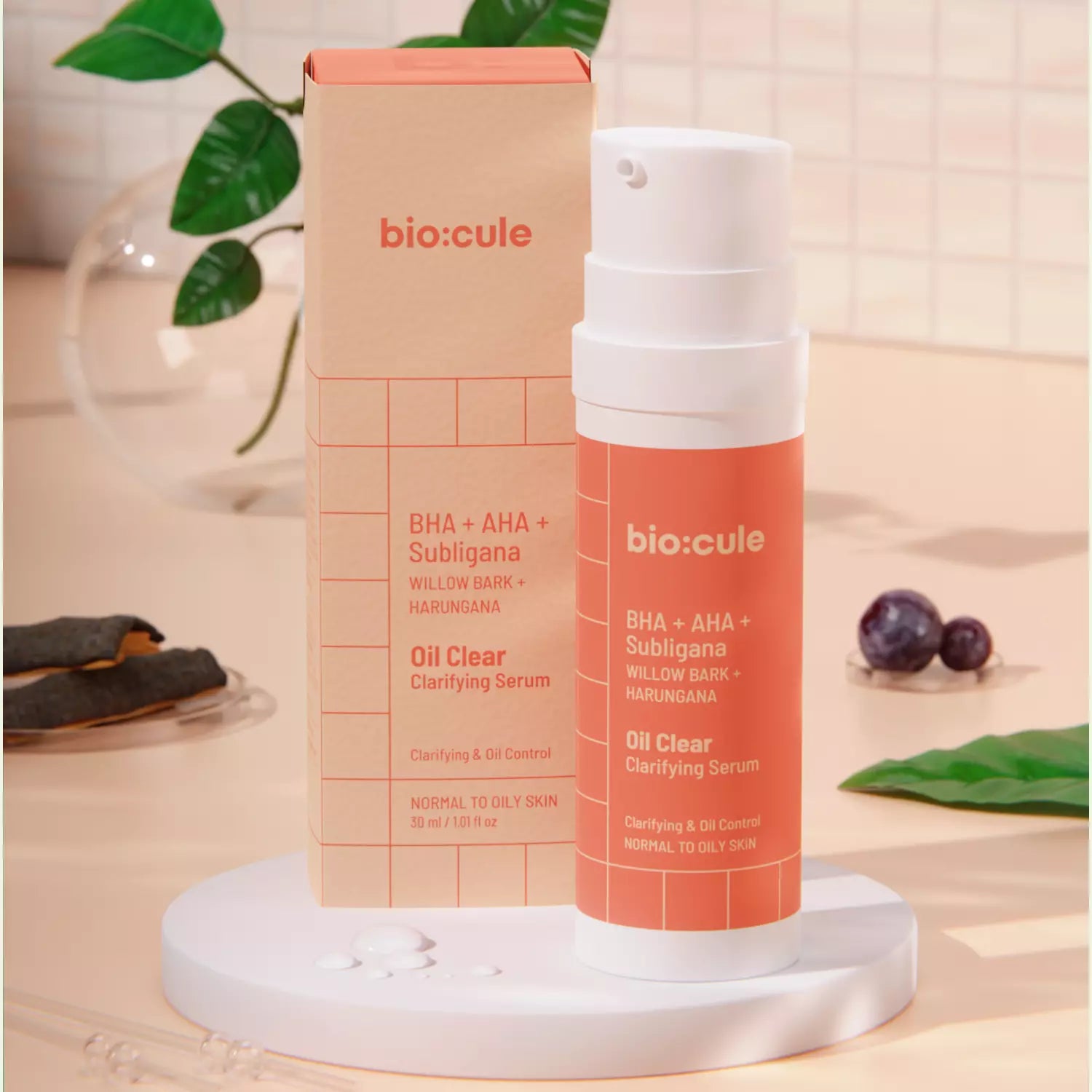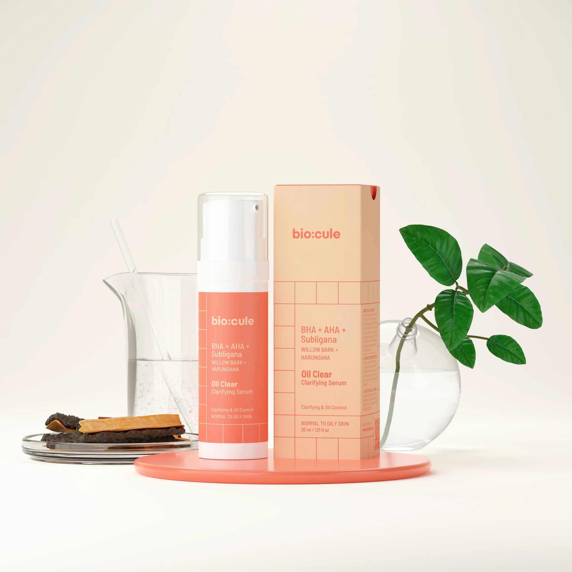 Enriched with BHA from Willow Bark, AHAs from Fruit Mix & Subligana from Harungana, biocule Oil Clear Clarifying Serum cleanses, minimizes & tightens open pores, removes excess sebum and provides gentle exfoliation to help you achieve a naturally clear, oil-free, matte look.